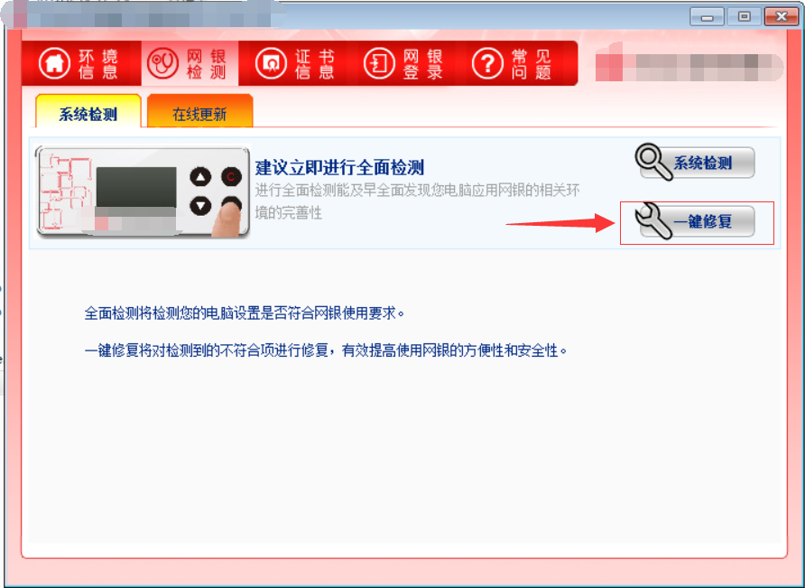 步骤二:如下图所示在开启网银助手后稍等片刻然后点击一键修复,如果修复失败的情况请关闭网银助手,并重新右键点击网银助手选择管理员权限运行再进行上述操作(一般win8及以上操作系统需要)